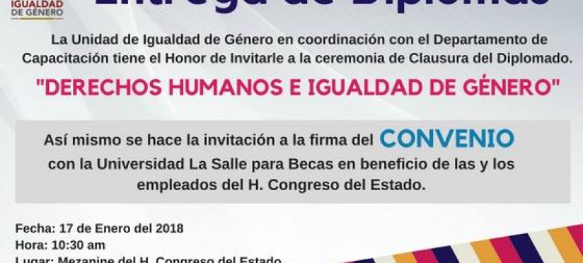 La Unidad de Igualad de Género en Coordinación con el Departamento de Capacitación tiene el Honor de Invitarle a la Ceremonia de Clausura del Diplomado “DERECHOS HUMANOS E IGUALDAD DE GÉNERO”. Así mismo se hace la invitación a la firma del Convenio con la Universidad La Salle para becas en beneficio de las y los empleados del H. Congreso del Estado. El día 17 de Enero de 2018 en punto de las 10:30 am en el Mezanine.