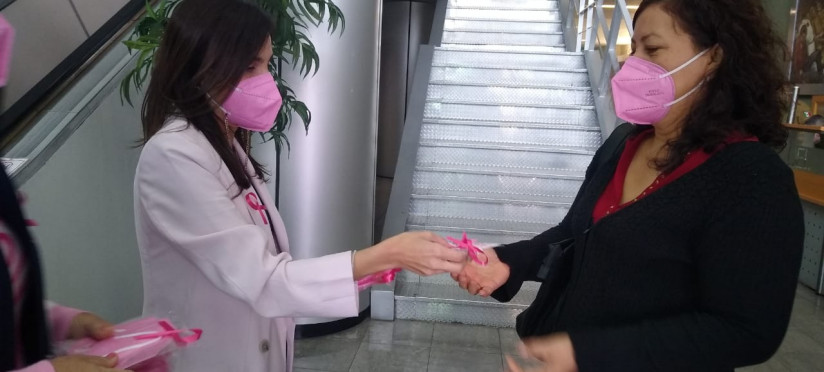 El día de hoy en el Recinto Legislativo, durante la hora de la entrada, se entregaron cubrebocas rosas a las y los colaboradores con el objetivo de sensibilizar sobre el cáncer de mama.