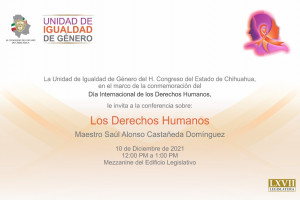 Con motivo de la conmemoración del Día Internacional de los Derechos Humanos, se hace un atenta invitación a participar en la Conferencia sobre los Derechos Humanos, que será impartida por el Mtro. Saúl Alonso Castañeda Domínguez de la Comisión Estatal de los Derechos Humanos de Chihuahua.