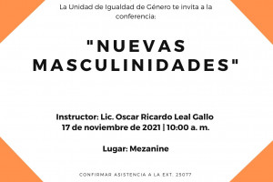 La Unidad de Igualdad de Género hace una atenta invitación para que los colaboradores del H. Congreso del Estado de Chihuahua participen en la conferencia: "Nuevas Masculinidades" que tiene como objetivo que los participantes reflexionen sobre la idea de la masculinidad, para que logren construir relaciones más igualitarias y sanas en todos los ámbitos. Dicha conferencia será impartida por el Centro de Atención y Prevención Psicológicas (CAPPSI) a través del instructor el Lic. Oscar Ricardo Leal Gallo experto en el tema. La charla se llevará a cabo el miércoles 17 de noviembre del 2021 a las 10:00 horas en el Mezanine. Confirma tu participación en la extensión 25077.