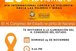 La Unidad de Igualdad de Género le invita a la iluminación del H. Congreso del Estado de color naranja, por motivo del Día Internacional Contra la Violencia hacia las Mujeres y Niñas. El día 25 de Noviembre en punto de las 6:00 pm. ¡No faltes!