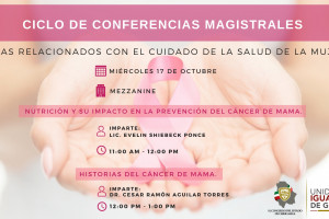 Invitación al personal del H. Congreso del Estado así como a público en general. Temas relacionados con el cuidado de la salud de la mujer. Fecha: 17 DE OCTUBRE Lugar: Mezzanine CONFERENCIA 1 “Nutrición y su Impacto en la Prevención del Cáncer de Mama”. Imparte: Lic. Evelin Shiebeck Ponce Hora: 11:00 am a 12:00 pm CONFERENCIA 2 “Historias del Cáncer de Mama”. Imparte: Dr. Cesar Ramón Aguilar Torres Hora: 12:00 pm a 1:00 pm Para más información comunícate a la extensión: 25077.