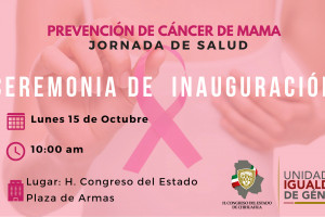 JORNADA DE SALUD “PREVENCIÓN DE CÁNCER DE MAMA”. La Unidad de Igualdad de Género hace la más cordial invitación a todo el personal del H. Congreso del Estado a la ceremonia de Inauguración de la Jornada de Salud “Prevención de Cáncer de Mama”. Fecha: 15 de octubre Hora: 10:00 am Lugar: Plaza de armas Exterior H. Congreso del Estado. Para más información comunícate a la extensión: 25077