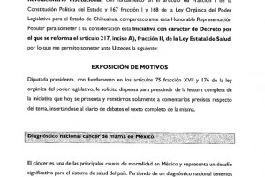 Se presentó la iniciativa con carácter de decreto, que pretende reformar el artículo 217, inciso A), fracción II, de la Ley Estatal de Salud, en materia de atención de cáncer de mama. #actividadenelpleno https://www.congresochihuahua2.gob.mx/biblioteca/iniciativas/archivosIniciativas/22544.pdf