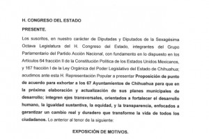 Se presentó una proposición con carácter de punto de acuerdo, a efecto de exhortar a los 67 Ayuntamientos de Chihuahua, para que en la próxima elaboración y actualización de sus planes municipales de desarrollo; integren ejes transversales, orientados a fortalecer el desarrollo humano, la igualdad sustantiva, la equidad y la transparencia. #actividadenelpleno https://www.congresochihuahua2.gob.mx/biblioteca/iniciativas/archivosIniciativas/22546.pdf