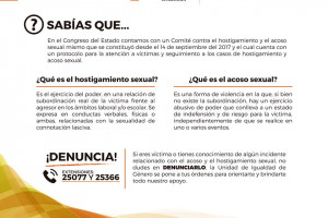 En el H. Congreso del Estado contamos con un Comité contra el Hostigamiento y el Acoso Sexual mismo que se constituyó desde el 14 de septiembre del 2017 y el cual cuenta con un protocolo para la atención a víctimas y seguimiento a los casos que se presenten.