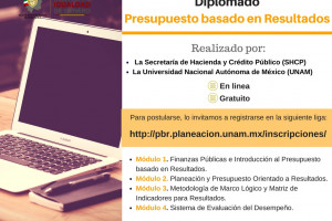 Realizado por la Secretaría de Hacienda y Crédito Público (SHCP) junto con la Universidad Nacional Autónoma de México (UNAM), iniciará el día 31 de julio del presente año. El Diplomado es gratuito y se imparte completamente en línea. Los temas que lo componen están distribuidos en cuatro módulos con una duración total de 160 horas. El tiempo de impartición es de cuatro semanas por módulo, con el siguiente contenido: Módulo 1. Finanzas Públicas e Introducción al Presupuesto basado en Resultados Módulo 2. Planeación y Presupuesto Orientado a Resultados Módulo 3. Metodología de Marco Lógico y Matriz de Indicadores para Resultados Módulo 4. Sistema de Evaluación del Desempeño. Para postularse, lo invitamos a registrarse en la siguiente liga: http://pbr.planeacion.unam.mx/inscripciones/ Fecha límite de regristro 20 de Julio.