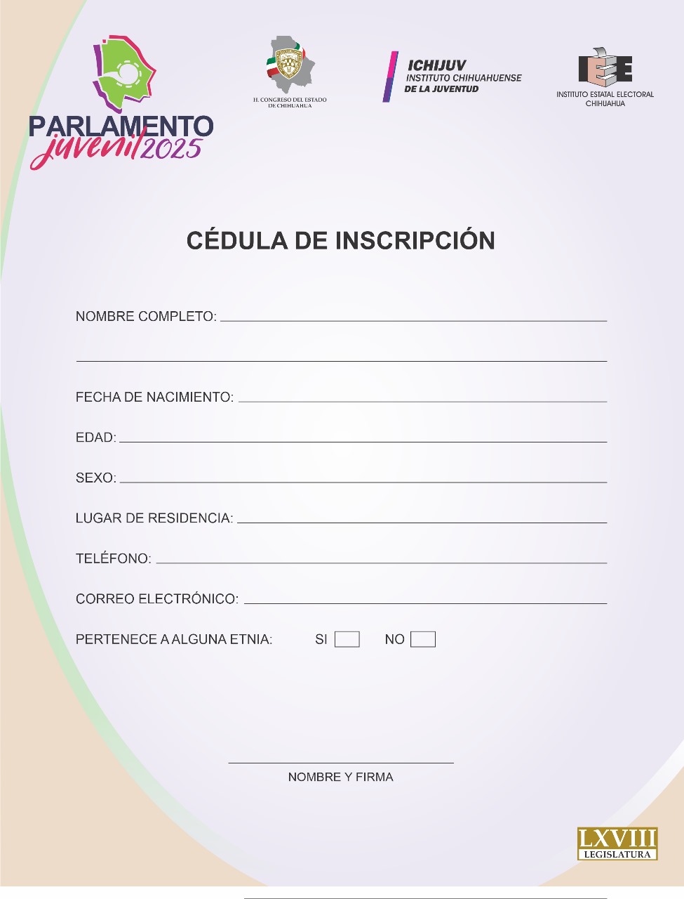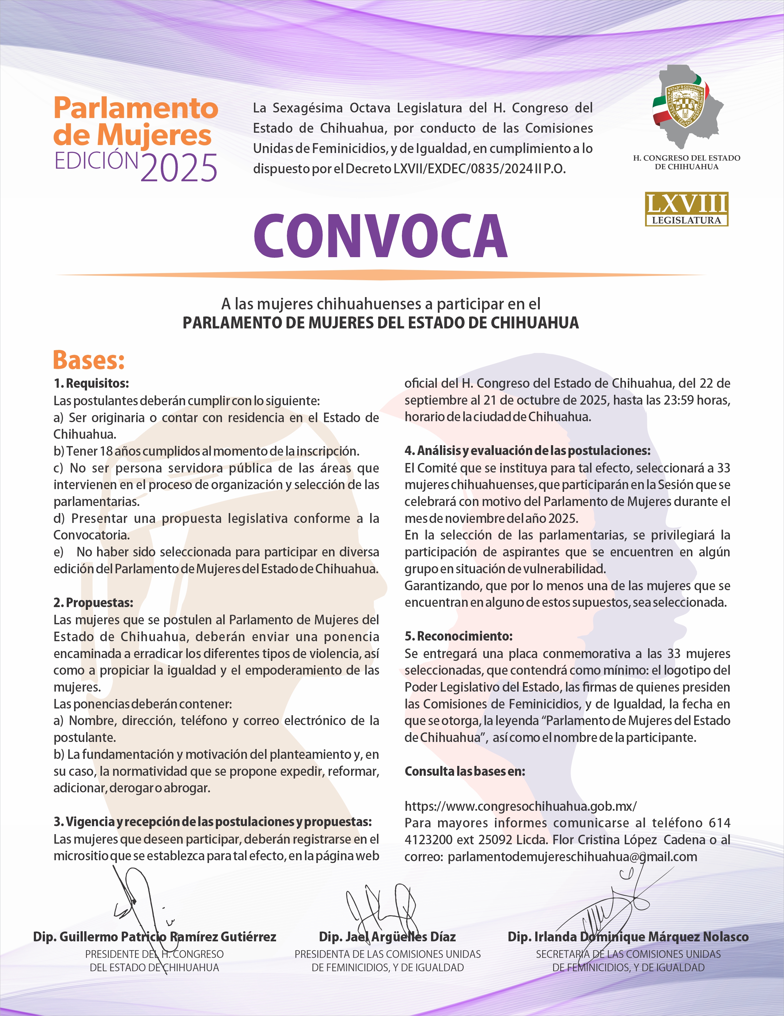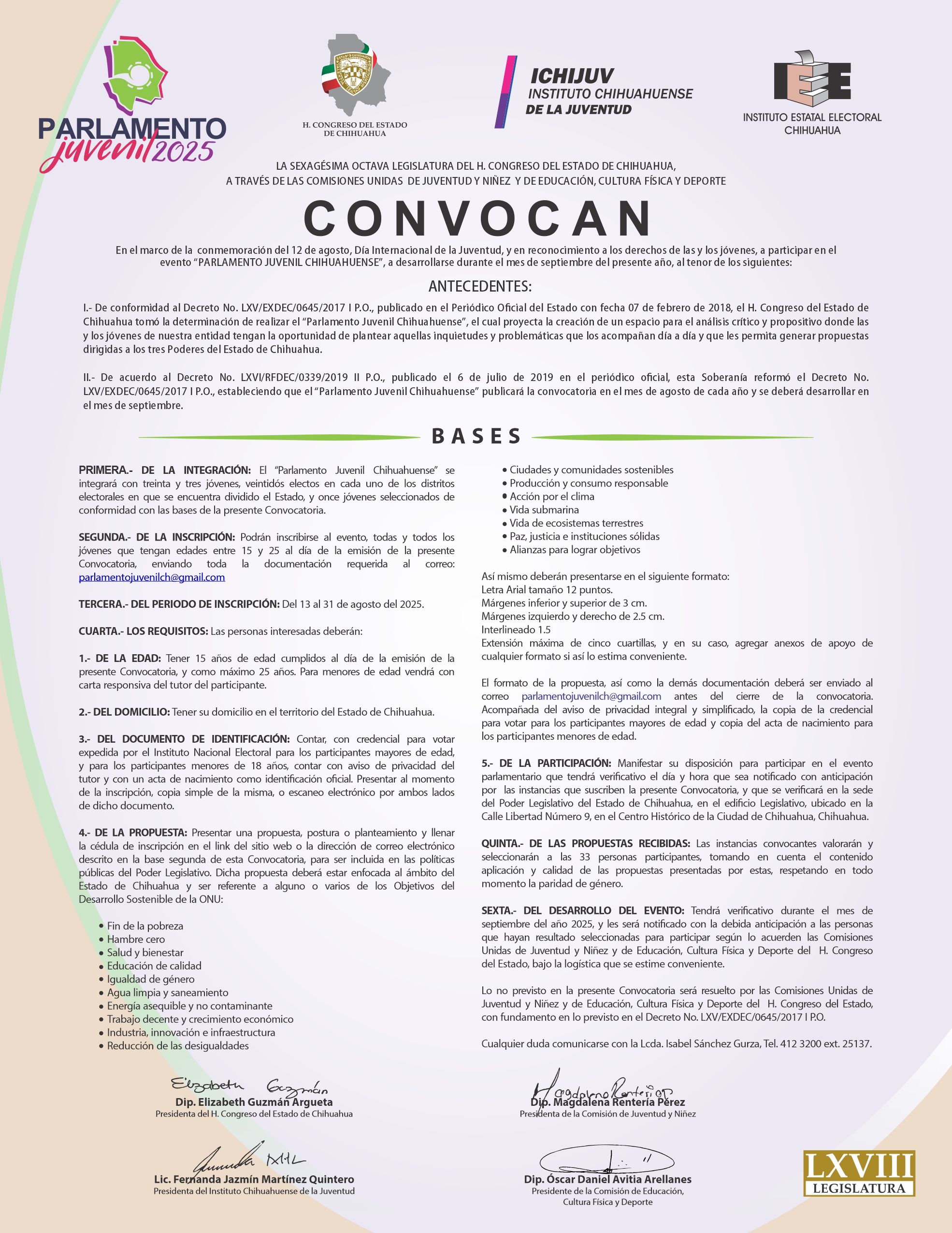 Convocatoria en el marco de la conmemoración del 12 de agosto, Día Internacional de la Juventud, y en reconocimiento a los derechos de las y los jóvenes, a participar en el evento "PARLAMENTO JUVENIL CHIHUAHUENSE", a desarrollarse durante el mes de septiembre del presente año 2025.